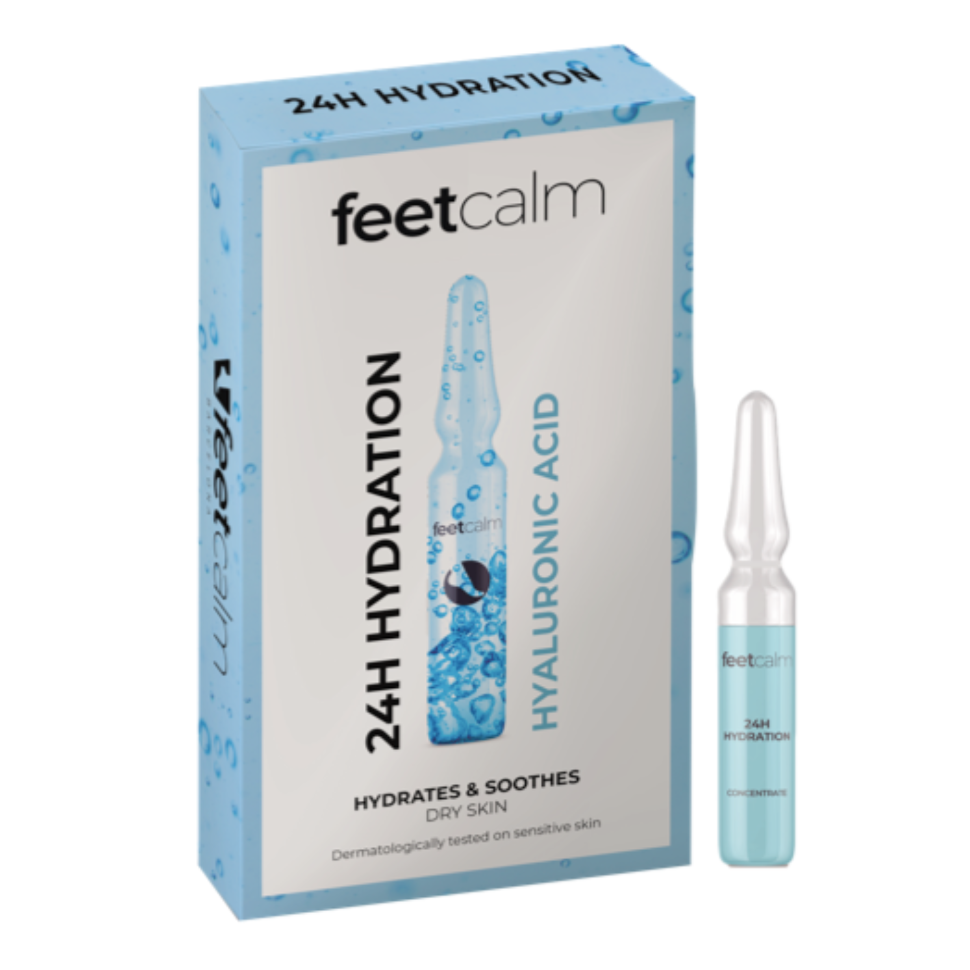 Feetcalm 24H Hydration Concentrate je vrhunska, enkratna ampula za globinsko nego suhe in dehidrirane kože stopal. Vsaka ampula vsebuje aktivno sestavino hialuronske kisline, ki zadrži vlago in izboljša videz kože ter zmanjšuje fine linije . Dodatno formulo podpirata alantoin in 15 % urea: