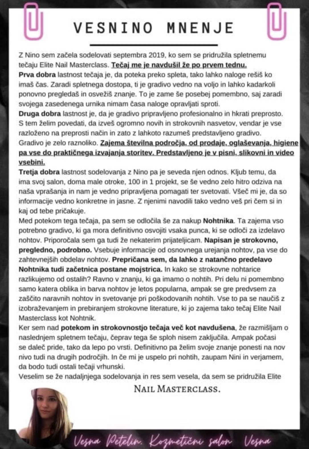 Moji certificirani tečaji za nohte, se razlikujejo po izjemnih temeljih varne izdelave, žal se teh temeljev ne učiš v šoli, niti na nobenem drugem tečaju. Drugje je fokus zgolj izdelava. Tečaji pri prodajalcih izdelkov, pa le pravilna uporaba izdelkov. Menim, da moramo imeti izjemne temelje, da preprečimo poškodbe ter ohranimo lastno zdravje. in na tem temelji celoten tečaj.
