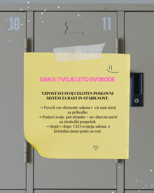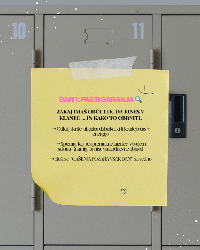 V 5 dneh bomo: ✨ odstranile hrup in kaos ✨ postavile tvoj stroj za prihodke ✨ ustvarile sistem, ki deluje, tudi ko nisi v salonu