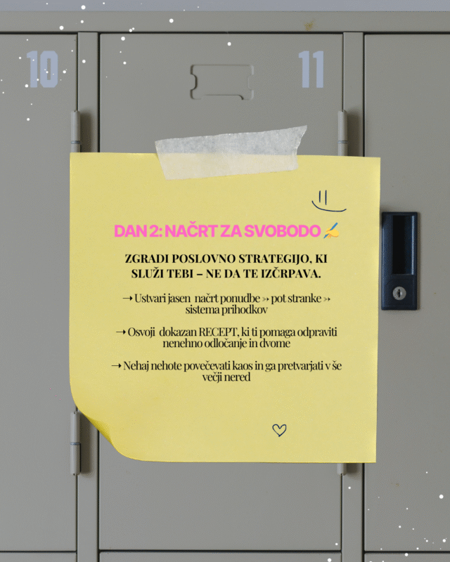 In ja – to počnemo na zabaven, dinamičen in interaktiven način, s praktičnimi nalogami, dnevnimi povzetki in jasno strukturo, ki jo boš lahko uporabila takoj.